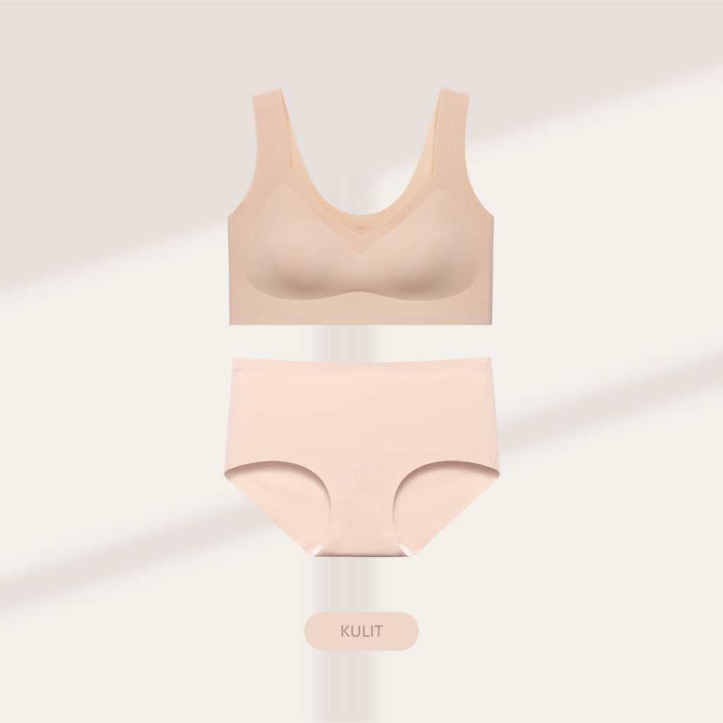 Set bra tanpa jahitan + celana dalam warna senada. Tampil rapi, nyaman, dan lebih hemat!